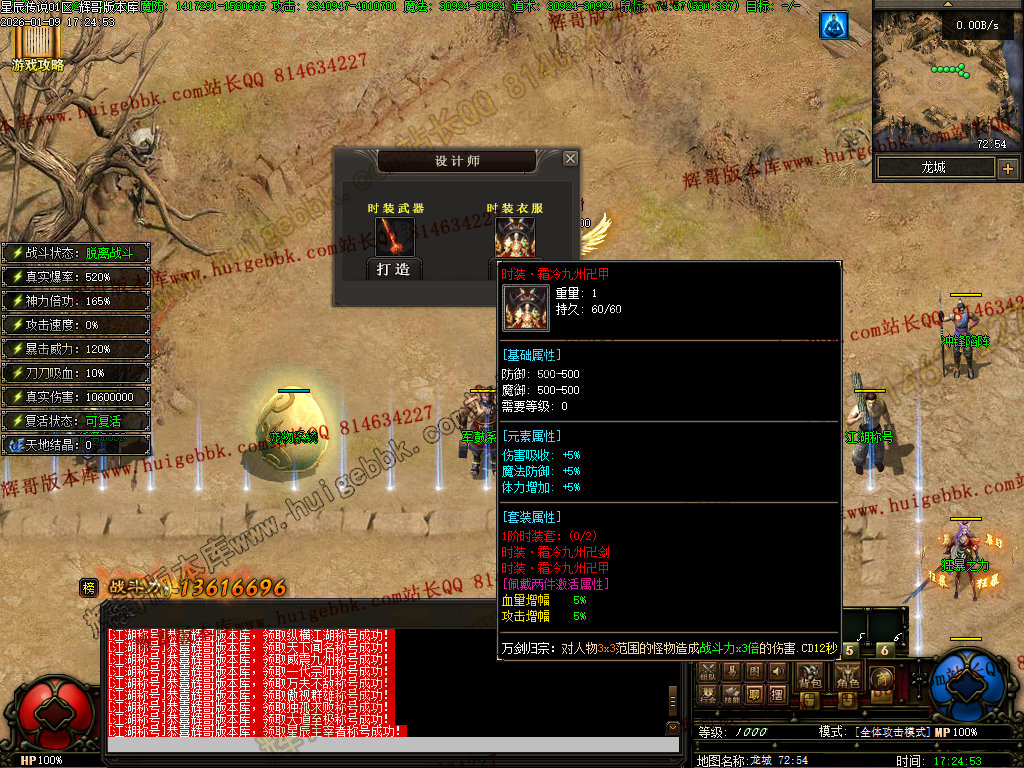 全部五个职业技能全部领悟完成后,自动获得称号”先天圣体*——————————————————————————————————江湖称号:玩家可在这里把称号升级到星辰主宰者,攻击伤害100%爆率提升1.40对怪真实伤害60万时装系统:玩家可在这里把时装升级到蛮荒战神级别,暴击几率20%攻击伤害20%忽视防御20%套装属性:血量增幅30% 攻击增幅30%万剑归宗:对人物3X3范围的怪物造成战斗力x12倍的伤害,CD12秒军鼓系统:玩家可在这里把军鼓升级成神海军鼓,固定属性:攻击力60%追加属性:生命值60%重生:死亡时立即回复100%的血量【CD60:秒】远古神技:魔法盾:免费合成,需技能残页1-9号十步一杀:免费合成,需技能残页1-9号禁忌心法:免费合成,需技能残页1-9号抱月剑法:免费合成,需技能残页1-9号冰霜群雨:免费合成,需技能残页1-9号卡牌系统:激活卡牌30张以上,获得初级卡牌大师称号