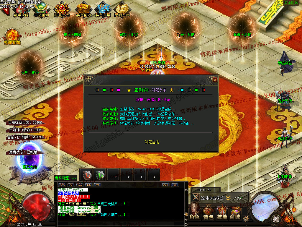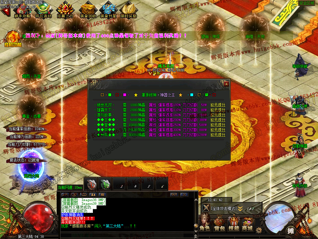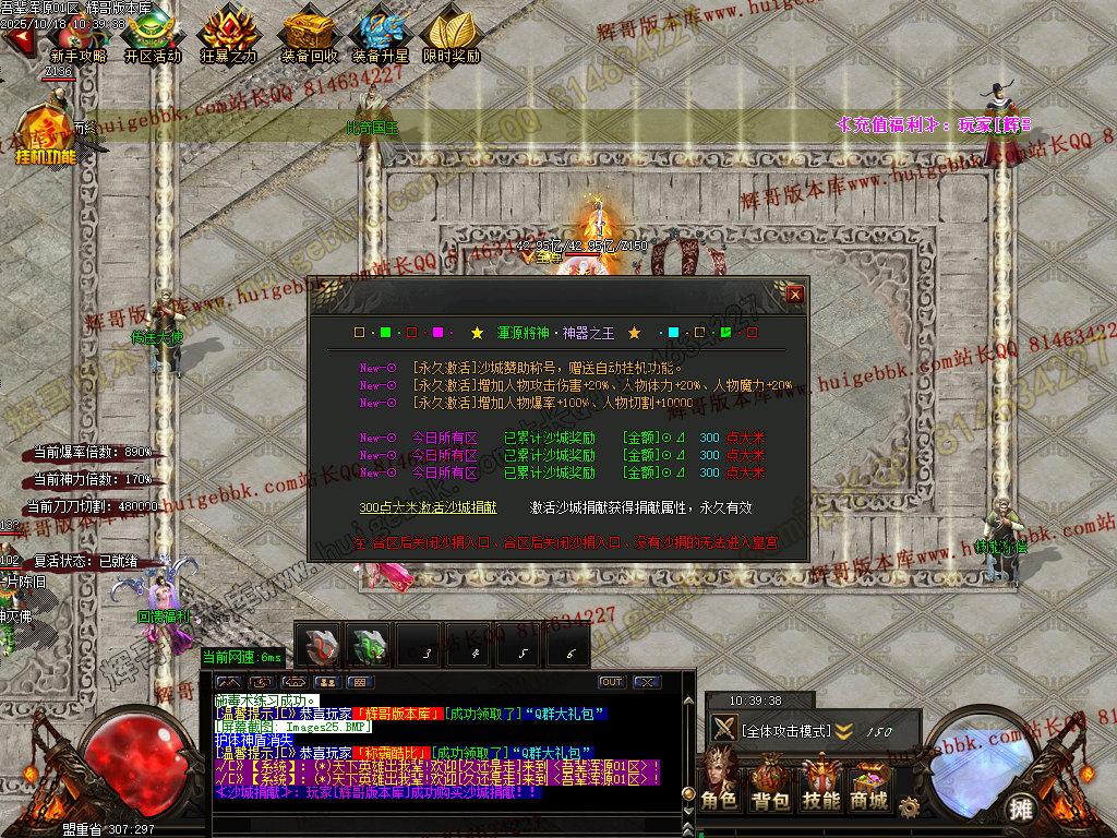 【310元档】(充值280元神晶即可)回馈+狂暴 + 三大路满盾牌+三大陆生肖切割神器+三大陆升级 + 充值300大米(30元)领取沙城捐献