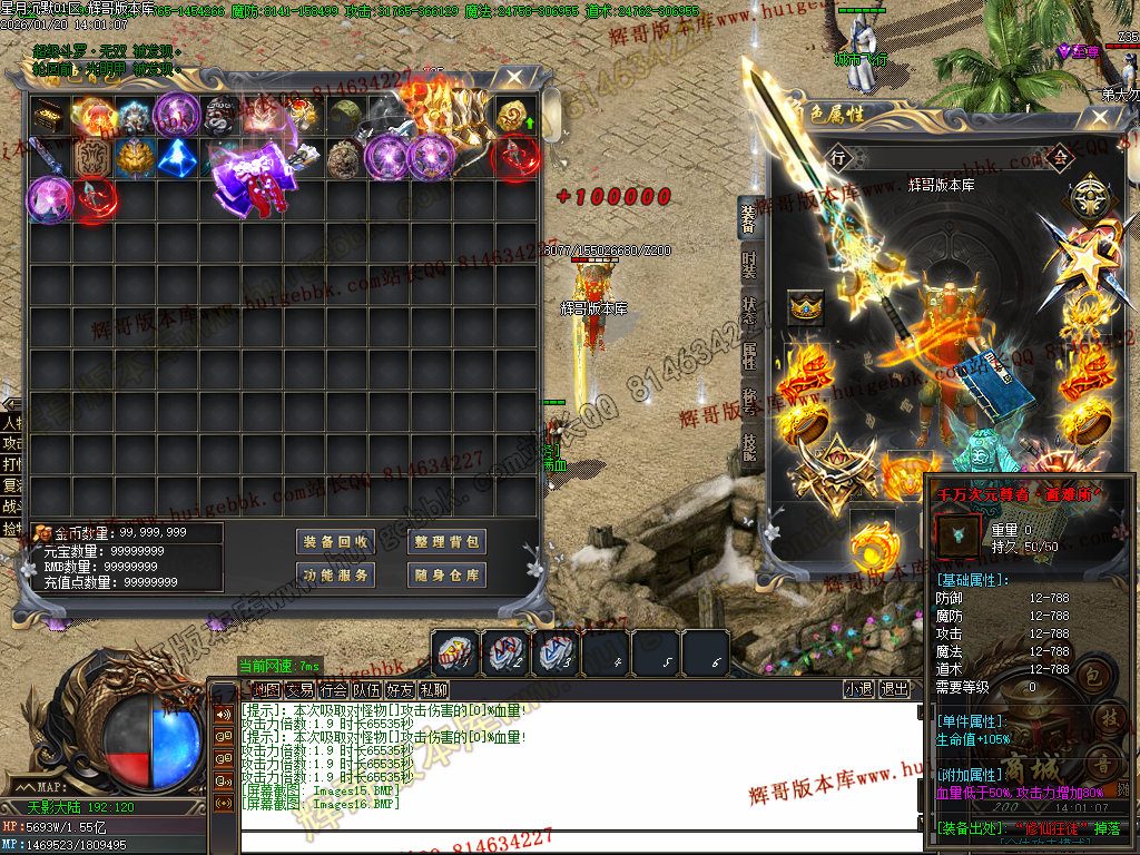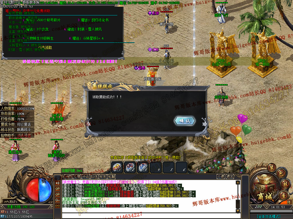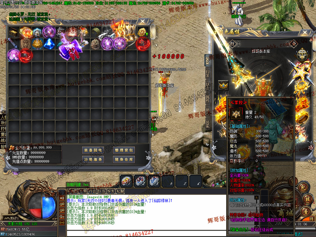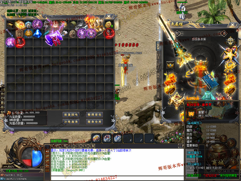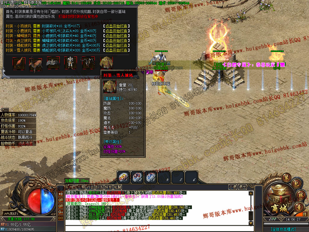 2.超级大礼包88充值点,赠送:时装·雪人披风,斗转星移lv.4 一代宗师称号 金币1500万 转生15转 群体施毒术 十步一杀 魔法盾