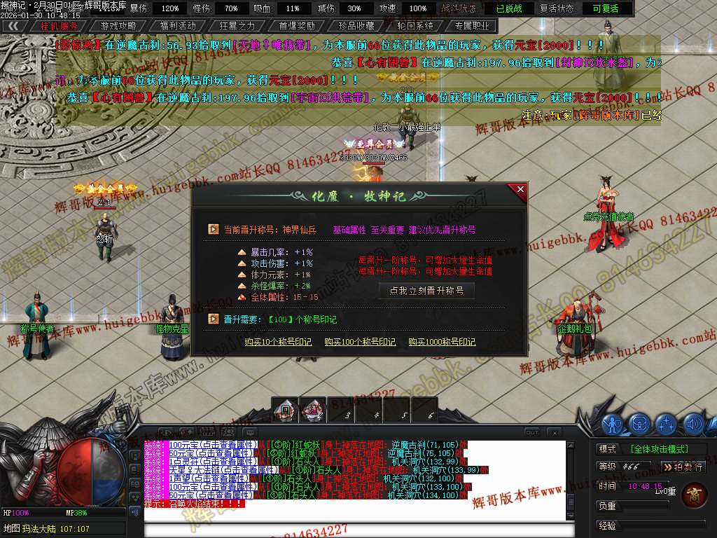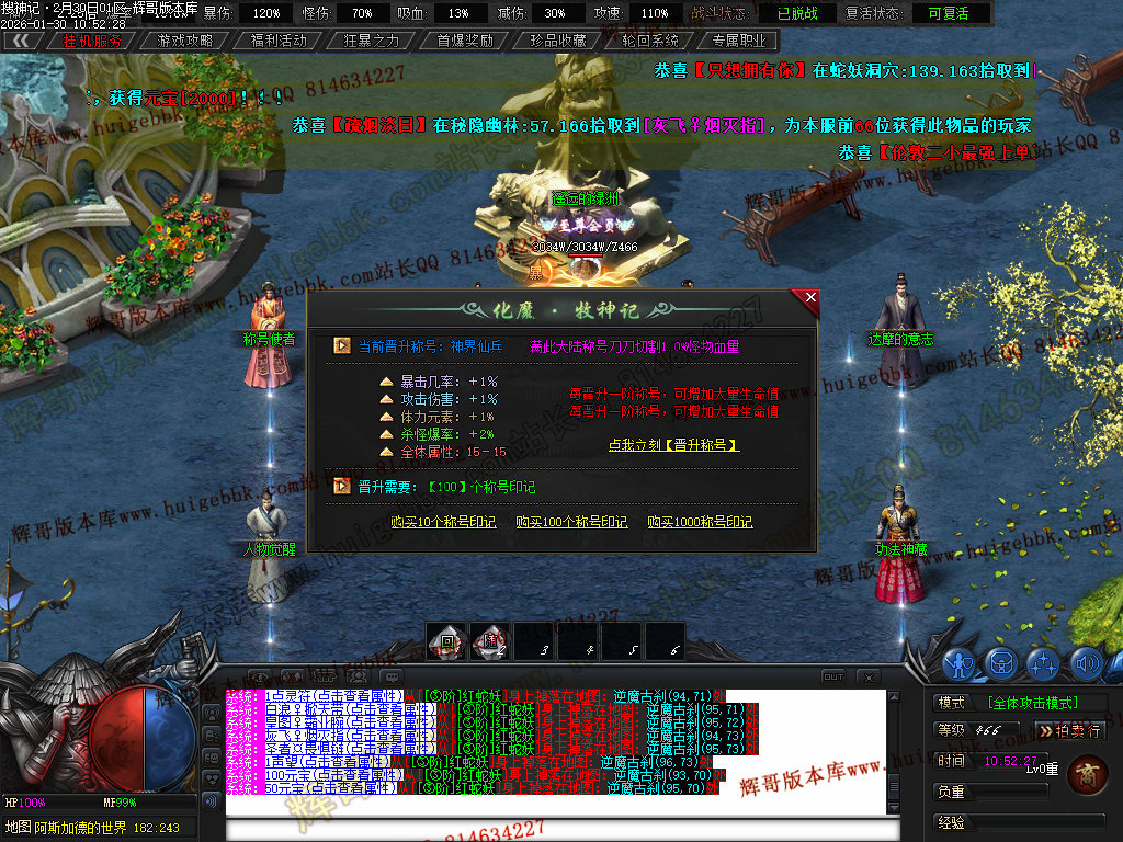 赠送 诛魔·十里狼烟称号卷- 攻击怪物附带,攻击伤害+400%·增幅对怪物伤害+140 总爆率6% 刀刀切割怪物10W血 任意怪)