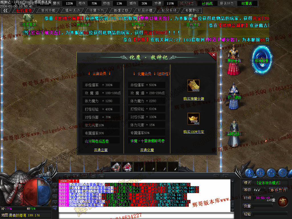 化魔会员1000充值点·(杀怪爆率+500% 攻魔道+288 体力+2280 杀怪经验+500% 对怪伤害+100% 体力元素+15% 专属爆率+50%