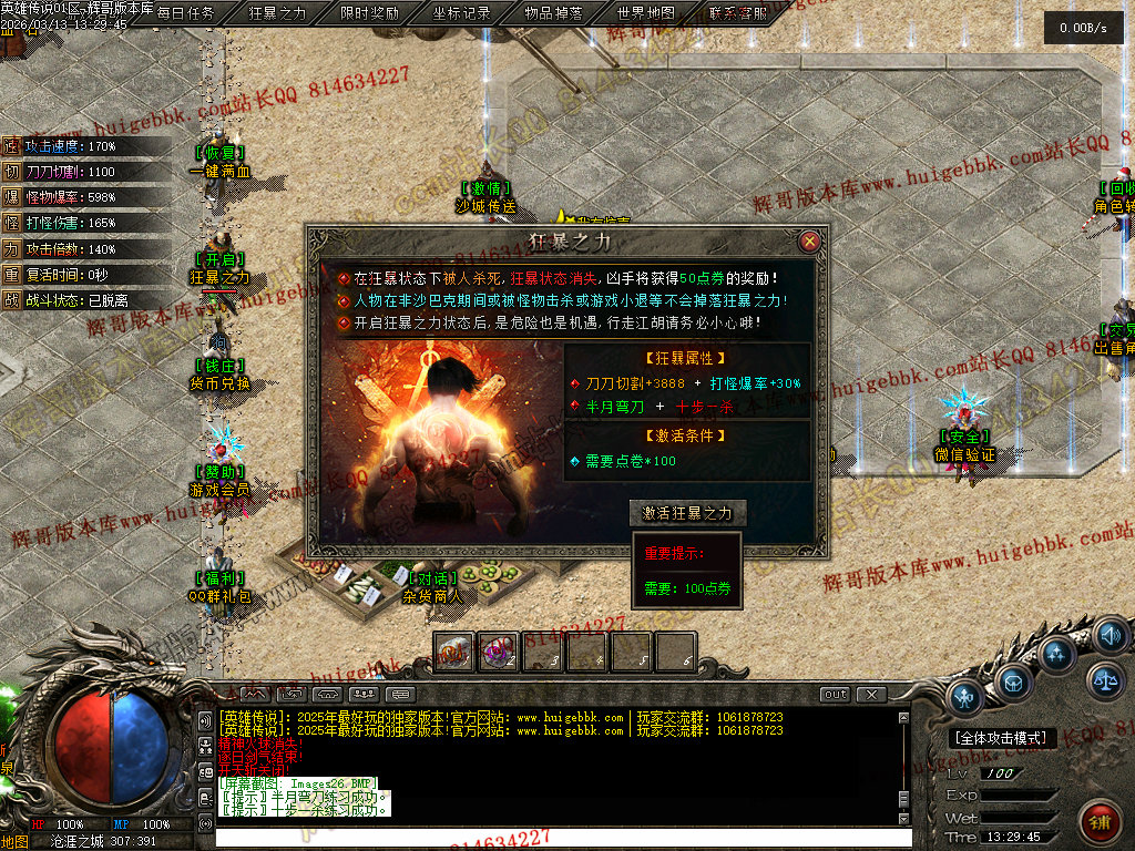 狂暴之力:刀刀切割+3888、打怪爆率+30%、半月弯刀十步一杀