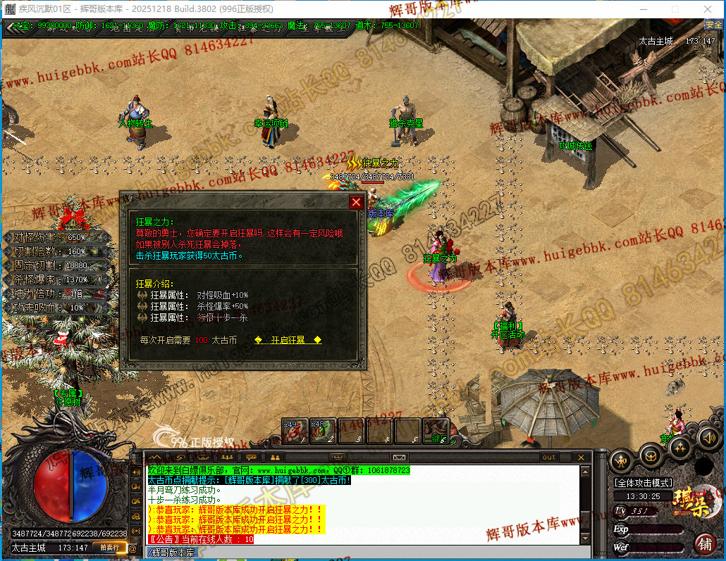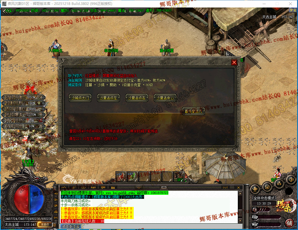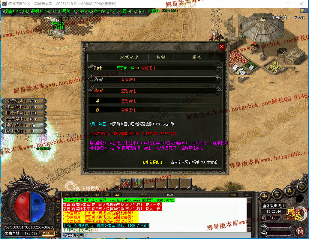 7、安全区沙城捐献,玩家开荒前,一定要拉满,即可获得榜一属性,给予半月弯刀 +群体施毒术,爆率加成,对怪伤害增加,固切自动打怪,回收比例增加