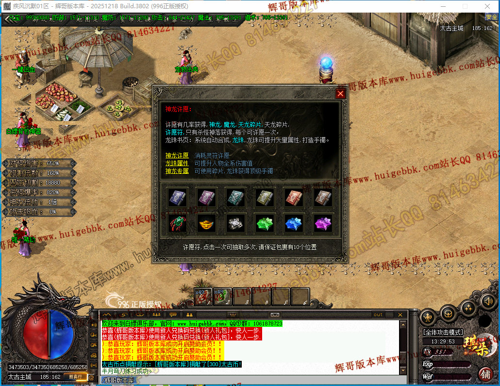 10、龙神许愿,需要许愿符才能进行抽奖,抽取出来的龙珠书籍,龙珠书4本合成一个龙珠40本 10各龙珠,(杀怪过程中自动合成)