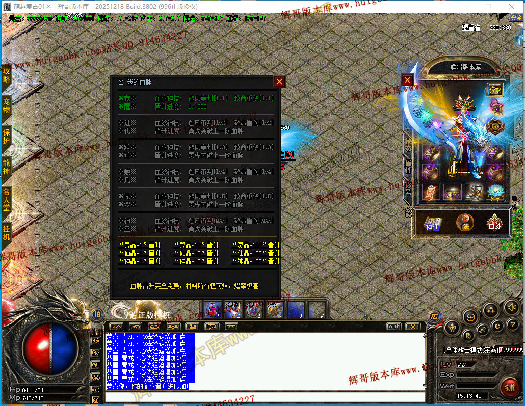 更新2:  更新了血脉BUFF:血脉靠打灵晶仙晶神晶升级.后面神炼需要神晶洗练.满神炼15星属性强大!