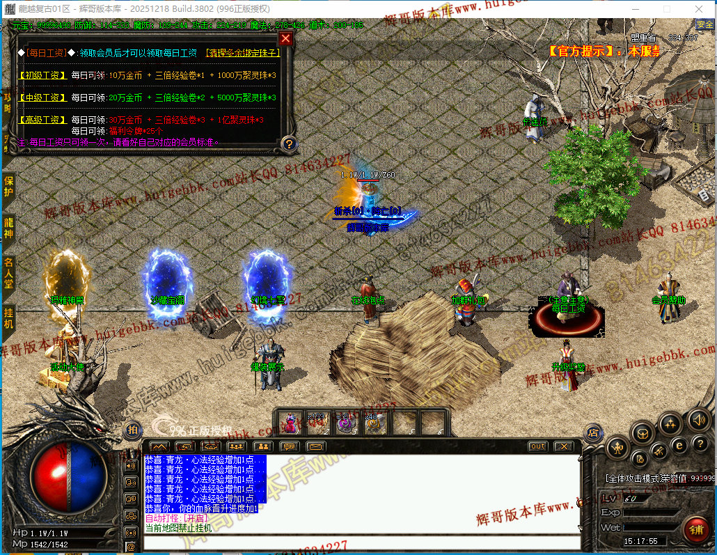 提示:每个档次会员可每日领取工资.高级会员可领取25个福利令牌.用于升级福利倍攻属性(散人可通过打怪跟工资领取获得)