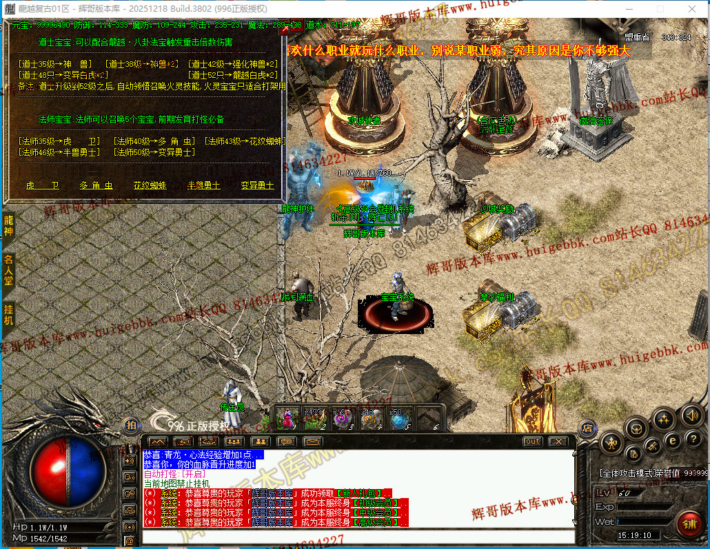 起步推荐职业:道士   (每个等级可召唤道士宝宝.52级可招龍越火灵宝宝.PK.单挑BOSS无压力)